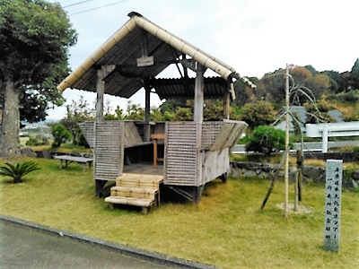 看板の後ろには、以前の研修生が地元の竹林整備で伐採した竹を用いて建てた