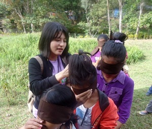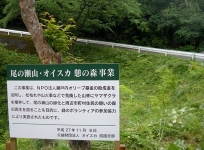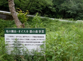 5月26日、「尾の瀬山・オイスカ憩いの森」づくり活動で、昨年のヤマザクラ植栽地の下草刈りを行い、
