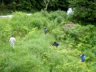 四国研修センターの職員と研修生に協力してもらい、急斜面で二時間ほど鎌や草刈り機を使って