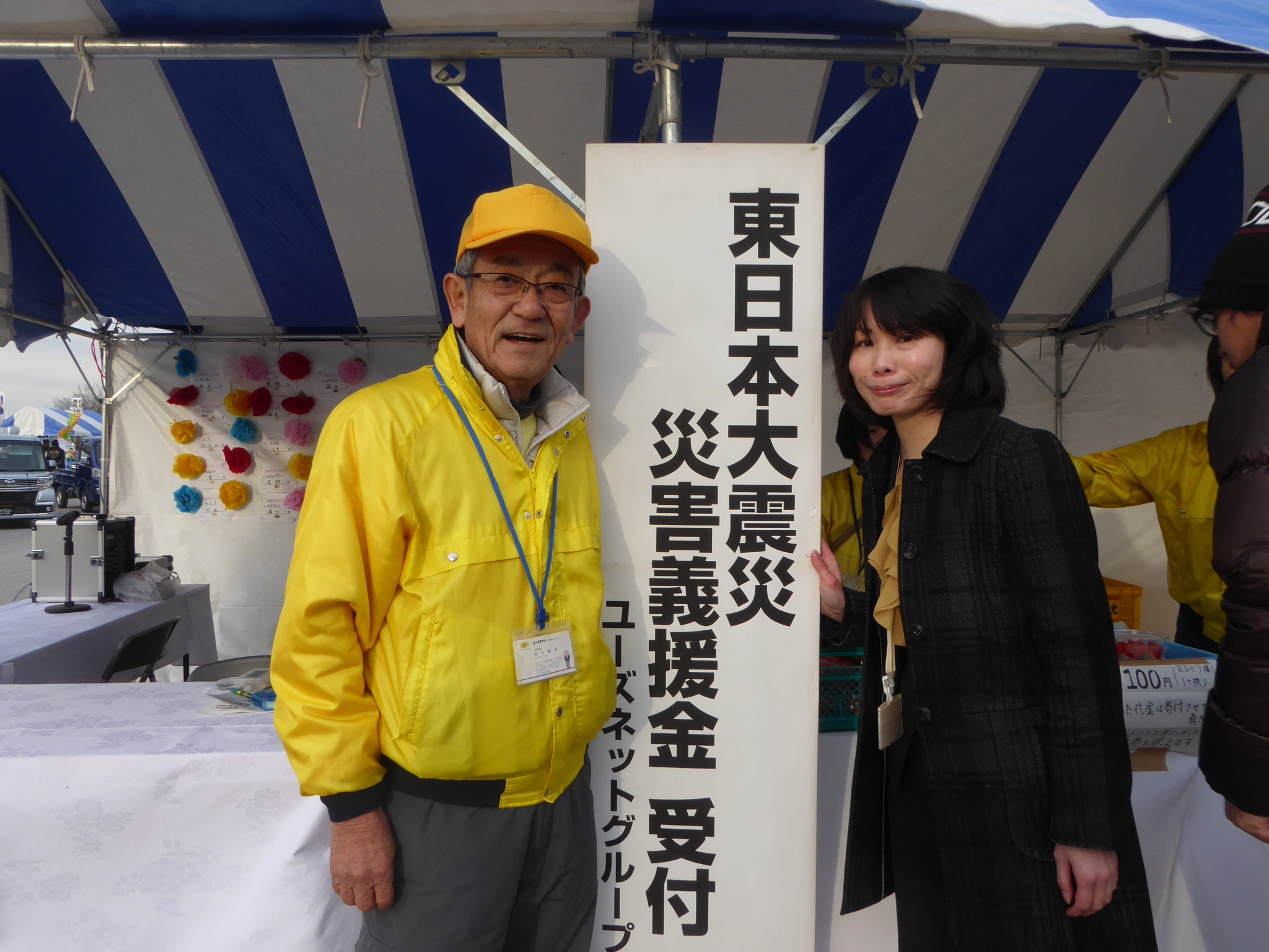 展示会会場であるトヨタスタジアムに到着し、展示会会場のゲートをくぐるとそこには・・・「東日本大震災災害義援金受付」という看板が出ています。そして看板の立つテントでは季節の果物がお手頃な値段で販売されています。その売上は何と全額オイスカを通じて「海岸林再生プロジェクト」に寄付されるそうです。