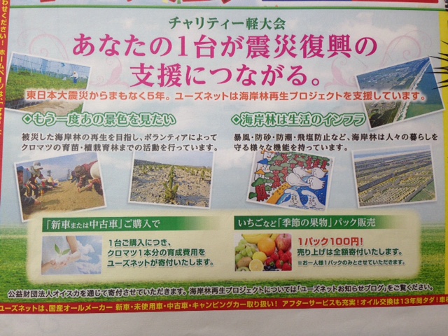 自動車を販売しているユーズネットさんでは展示会期間中に車1台売れる毎にクロマツ1本分の育成費用を海岸林再生プロジェクトに寄付するという取組を行っていました。展示会開催前には地元紙へ広告を出されていたのですが、その広告の大部分を同プロジェクトへのチャリティ呼びかけに使って下さったのです。