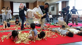 「つみ木シャワー」を浴びて、木の優しい香りを体いっぱいに感じた後、